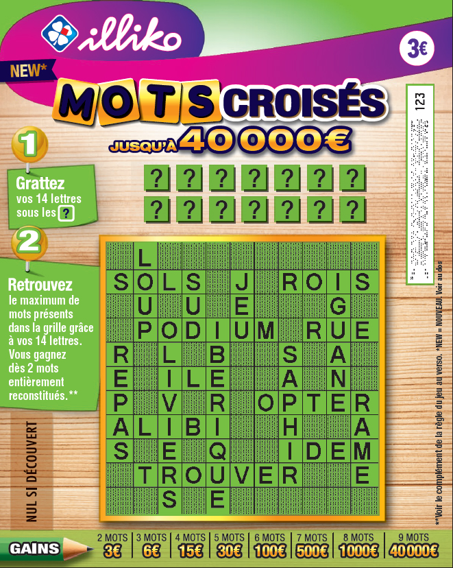 Le joueur se reporte au tableau des gains et gagne dès 2 mots entièrement reconstitués par grille.